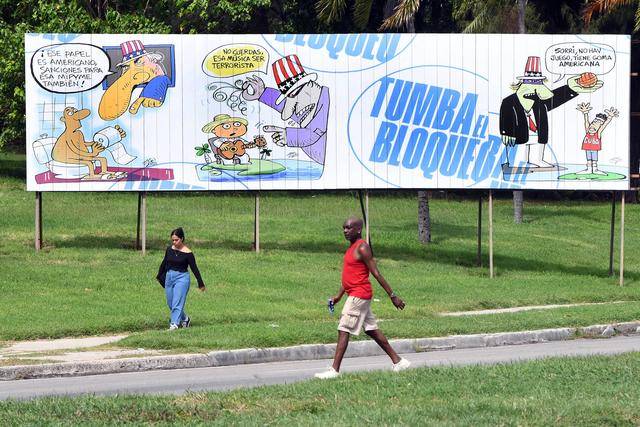 11月5日,在古巴首都哈瓦那,行人從譴責美國對古巴封鎖的宣傳牌前走過。宣傳牌的藍色大字寫著“推翻封鎖”,漫畫諷刺美國對古巴封鎖的荒謬性。 新華社發(華金·埃爾南德斯攝)