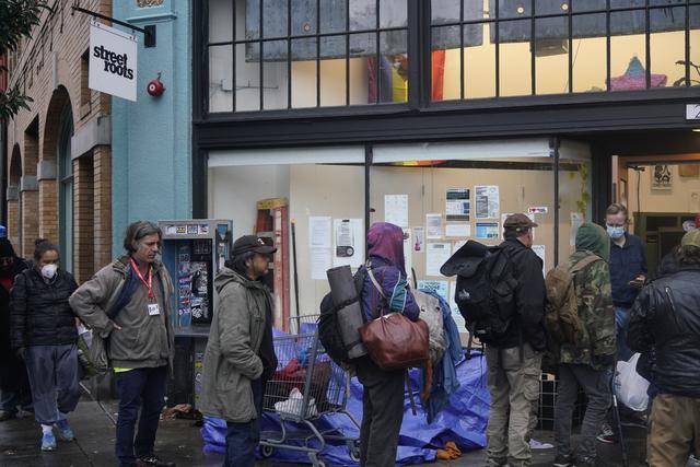 11月5日清晨,在美國波特蘭的深秋寒意中,無家可歸者排隊等待領取救助物品。 新華社記者 吳曉凌 攝