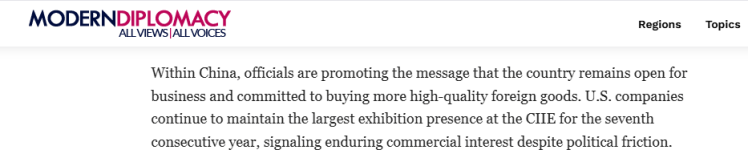 歐洲《現(xiàn)代外交》網(wǎng)站報(bào)道稱,進(jìn)博會(huì)是中國(guó)展示其全球經(jīng)濟(jì)地位的重要平臺(tái)。中國(guó)政府正積極傳遞一個(gè)明確信號(hào):中國(guó)將持續(xù)擴(kuò)大對(duì)外開放,并致力于采購(gòu)更多優(yōu)質(zhì)外國(guó)商品。此外,盡管存在貿(mào)易摩擦,美國(guó)企業(yè)仍連續(xù)第七年成為進(jìn)博會(huì)展商數(shù)量最多的外方代表,這顯示出美國(guó)企業(yè)對(duì)中國(guó)的商業(yè)熱情持續(xù)不減。