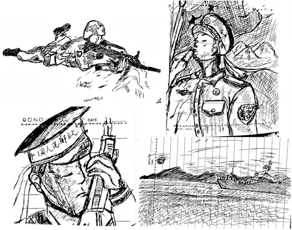 他的日記里,有摘抄軍旅歌曲《假如今天戰爭爆發》的歌詞,有他整理的“軍人常識”,有他記錄的“刺殺操”“軍體拳”的動作要領,有“槍不會自己射出,需要勇敢的心和強力的手”的名人名言,還有不少與軍旅生活相關的手繪。其中一幅他臥姿據槍瞄準的,被金母撕了下來,留作念想。